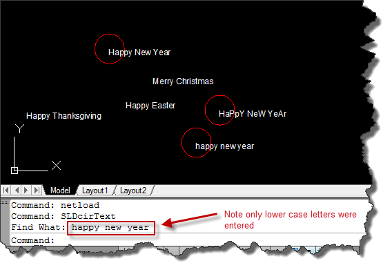To test this build the solution and NETLOAD the .dll into AutoCAD. Place some MText objects in the drawing and then type in SLDcirText at the command line. You will be prompted to enter a string to search for. Enter a string and regardless of case the matching strings should be circled.